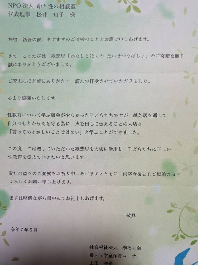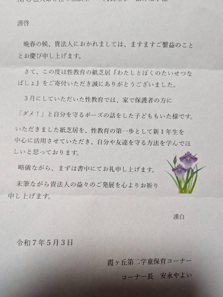 寄贈させて頂いた感謝のお手紙を頂きました。