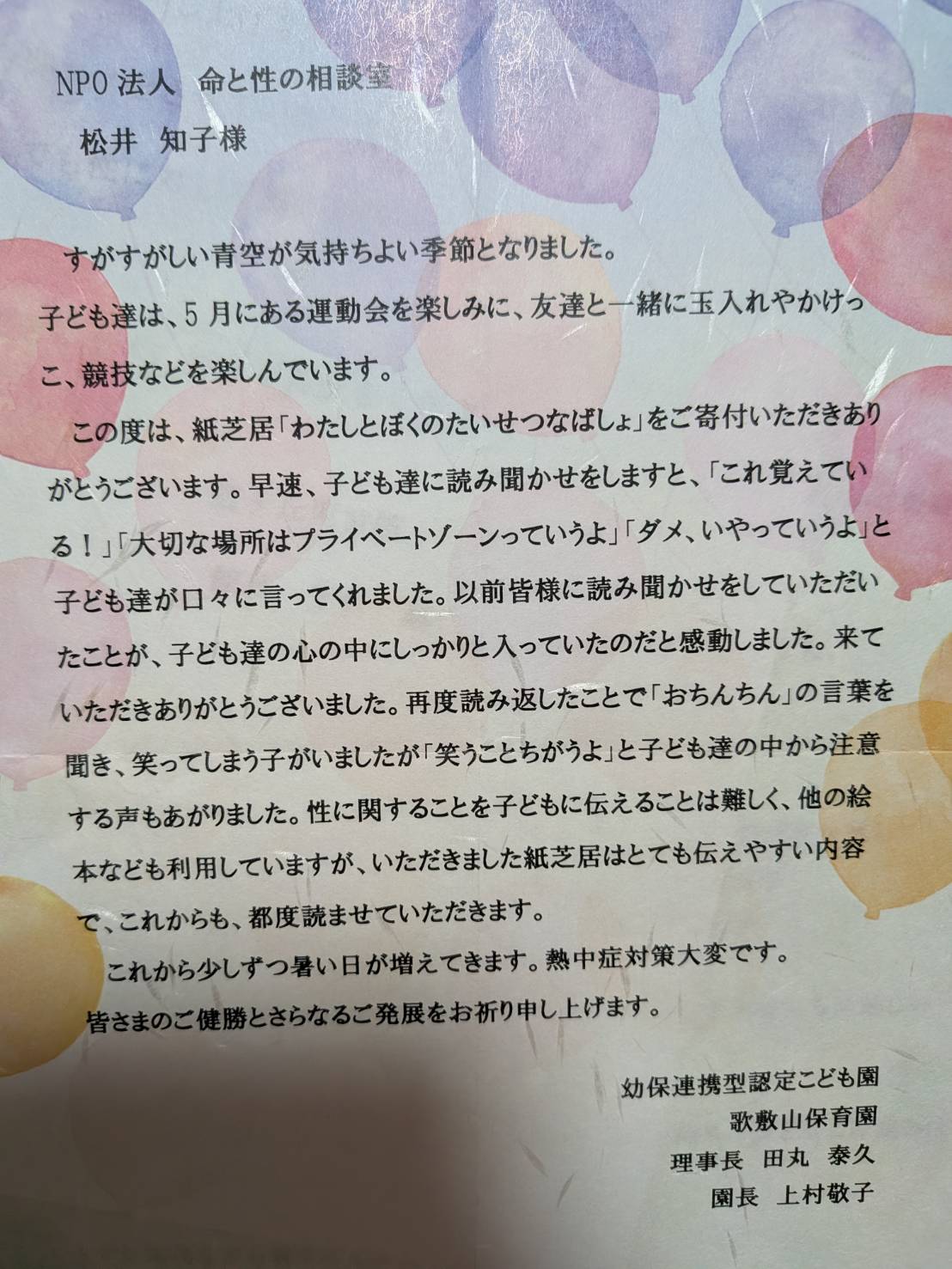 寄贈させて頂いた感謝のお手紙を頂きました。